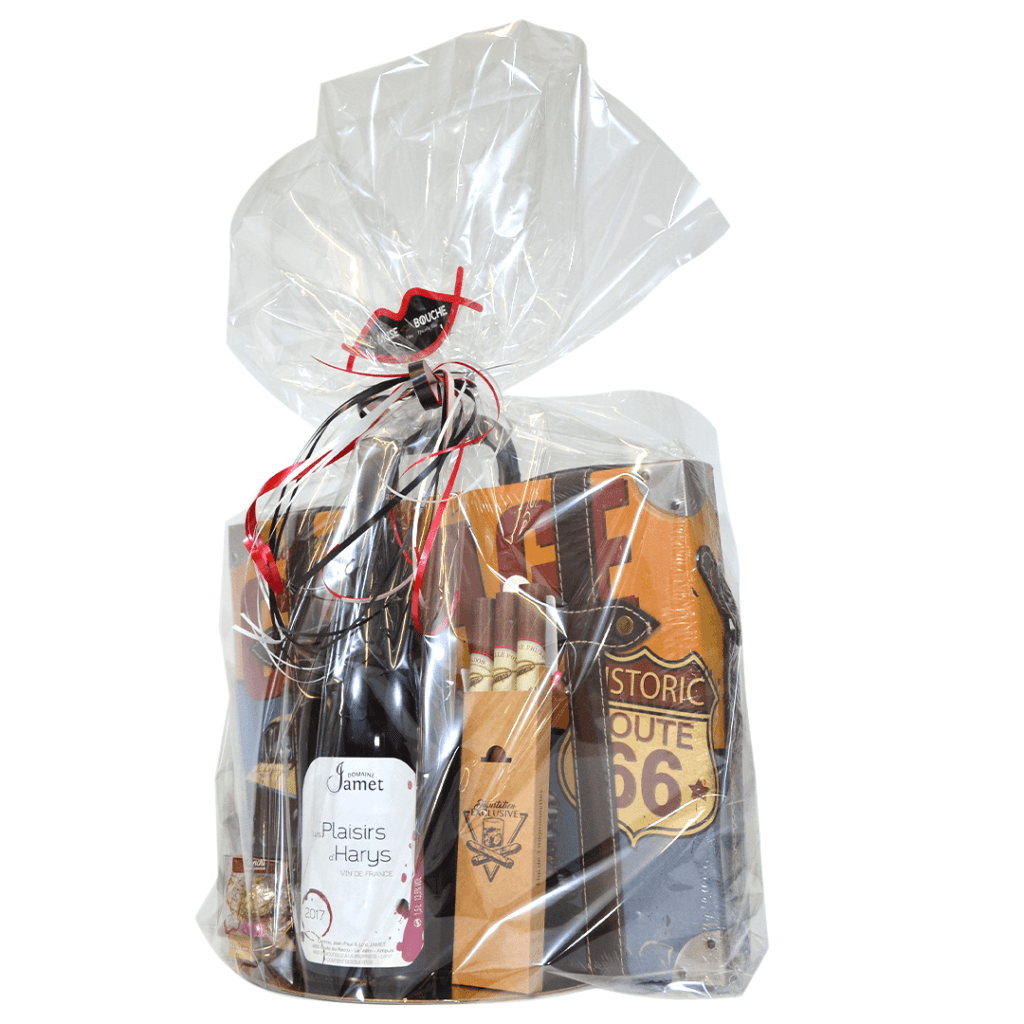 En exemple : la corbeille Route 66 avec de la décoration, des chocolats, du vin et des *faux* cigares de dégustation.